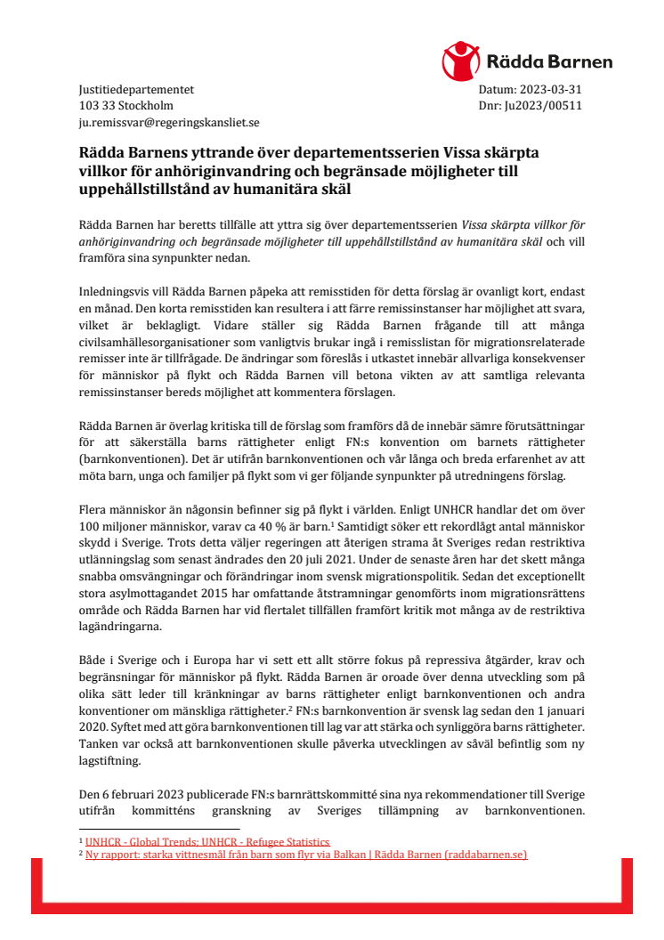 Rädda Barnens yttrande över Vissa skärpta villkor för anhöriginvandring och begränsade möjligheter till uppehållstillstånd av humanitära skäl