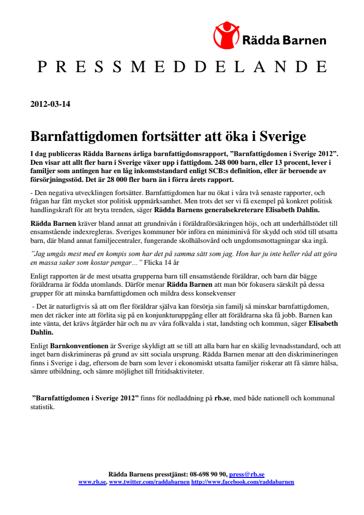 I dag publiceras Rädda Barnens årliga barnfattigdomsrapport, ”Barnfattigdomen i Sverige 2012”. Den visar att allt fler barn i Sverige växer upp i fattigdom. 248 000 barn, eller 13 procent, lever i familjer som antingen har en låg inkomststandard enligt SCB:s definition, eller är beroende av försörjningsstöd. Det är 28 000 fler barn än i förra årets rapport.