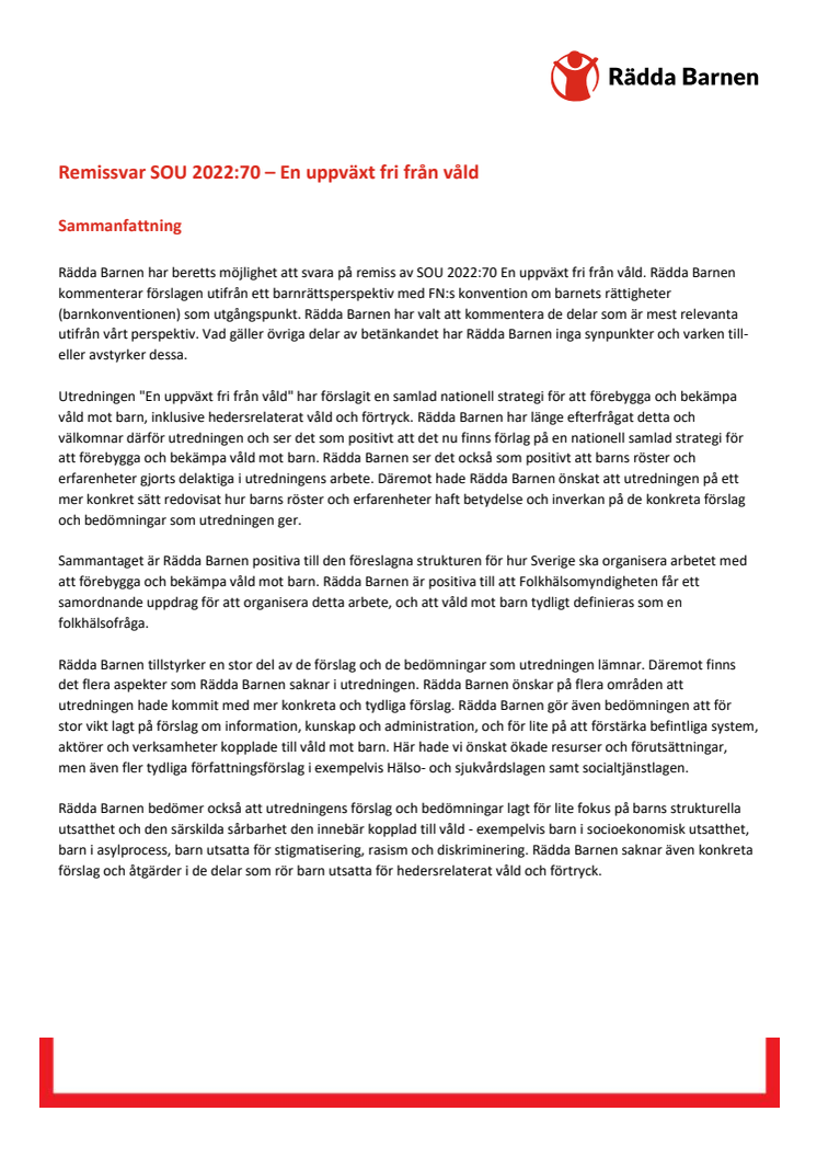 Rädda Barnens remissvar En uppväxt fri från våld