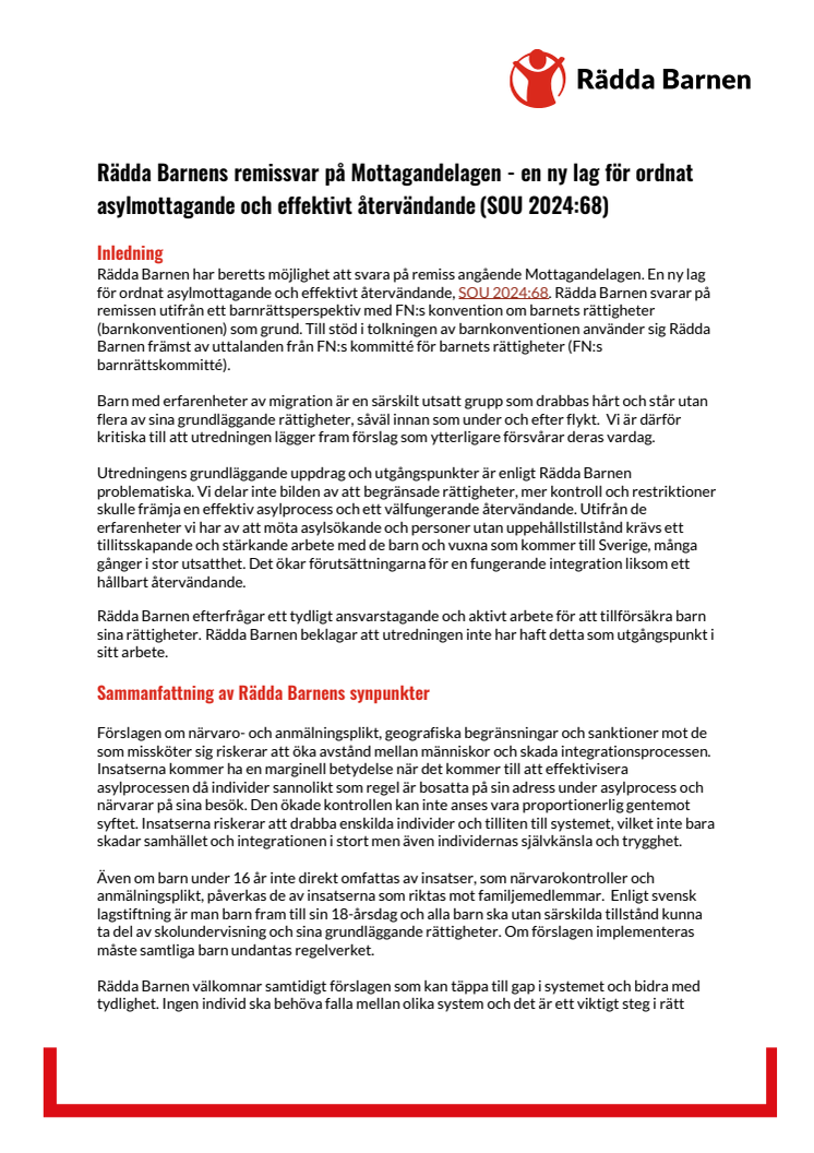 Rädda Barnens remissvar SOU2024_68 Mottagandelagen En ny lag för ordnat asylmottagande och effektivt återvändande.pdf