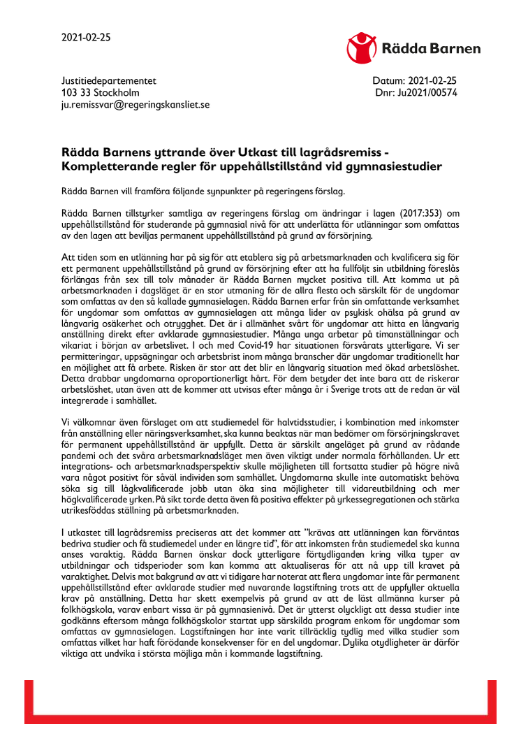 Rädda Barnens yttrande över kompletterande regler för uppehållstillstånd vid gymnasiestudier.pdf