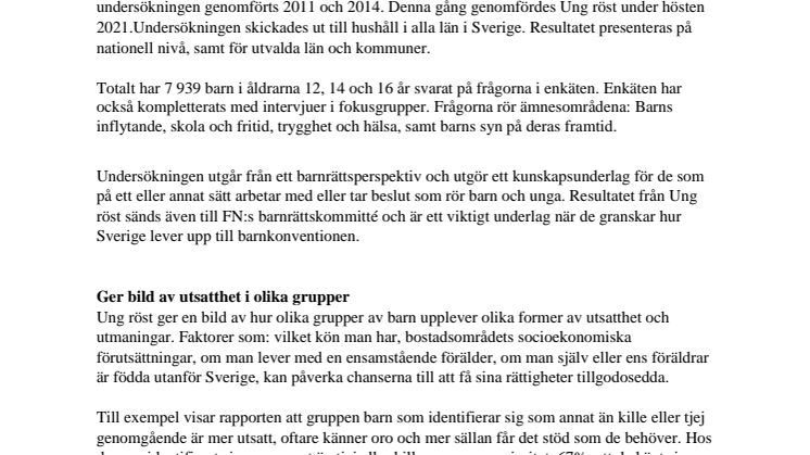 Fler resultat från Ung röst samt rekommendationer till politiker, finns i bilagan ”Sammanfattning av Ung röst”. Bilagan hittar du tillsammans med rapporten om du scrollar ner.